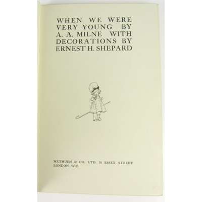 When We Were Very Young. London: Methuen & Co., 1924. First edition, first issue without the number 'ix' on contents page (although 'x' features on the verso), 8vo, original blue cloth gilt, t.e.g., a fine copy