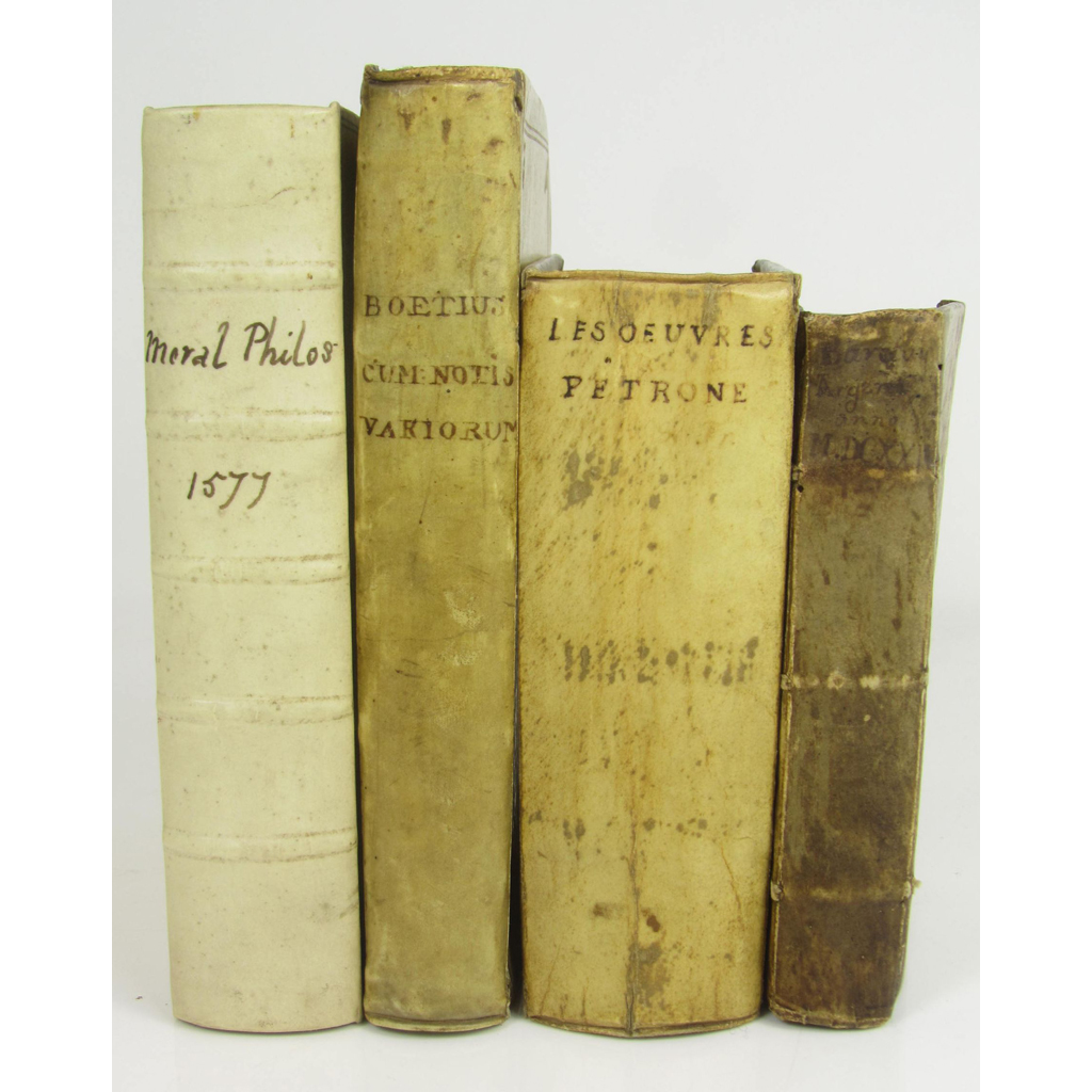 [The French Academie. N.p., n.d. but 17th century]. 8vo, lacking title-page, later vellum; Boethius, Anicius Manlius Severinus Philosophiae Libri V. Leiden: Hackiana, 1671. 8vo, additional engraved title-page, portrait, contemporary pigskin gilt; La Satyre de Petrone... Cologne: Pierre Groth, 1694. 12mo, engraved title, title-page in red and black, contemporary vellum, some internal repairs; Barclay, John Argenis, 1622. Small 8vo, contemporary vellum, final leaf torn with significant loss (4)