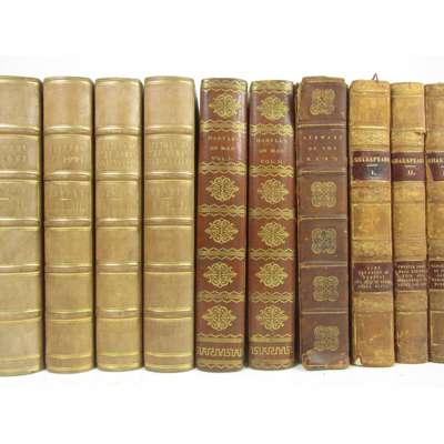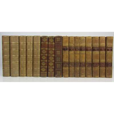 History of the later Roman Commonwealth. 1845; History of Rome. 1845, together 5 volumes, contemporary half calf, Shakespeare, William The Dramatic Works. 1825. 8 volumes, 8vo, engraved frontispiece, contemporary half calf, somewhat worn; Stewart, D. Elements of the Philosophy of the Human Mind. 1811. 8vo, contemporary diced calf, tear to head of spine; Hartley, David Observations on Man. 1810. 2 volumes, 8vo, frontispiece portrait, contemporary half calf gilt; Hogarth, William The Works. 1833. 2 volumes, 4to, portrait and 108 plates, dark green half morocco by Blair, Bookbinder of Morpeth, with his ticket, slightly spotted; Lacour-Gayet, G. Napoleon. 1921. 4to, mounted plates, green half morocco gilt; Aeschines & Demosthenes De Corona. 1807, half calf (20)