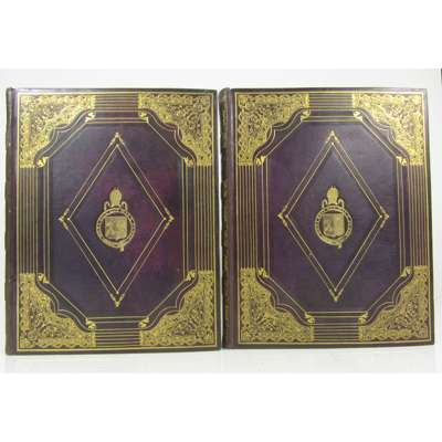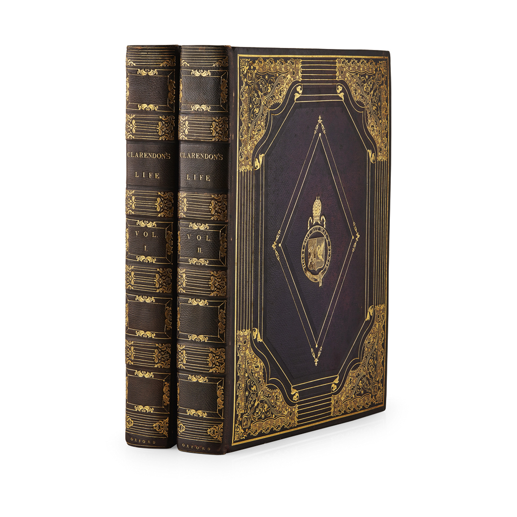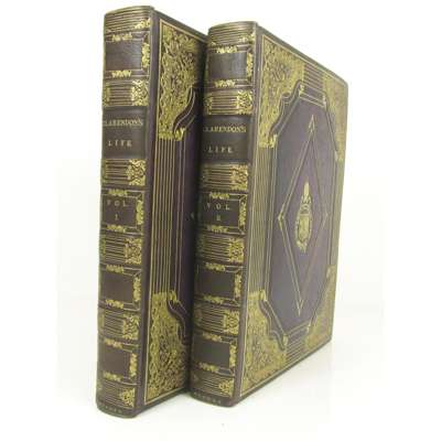 The Life of Edward Earl of Clarendon. Oxford: Clarendon Press, 1817. 2 volumes, 4to, engraved portrait frontispiece, contemporary maroon morocco, with arms of ?Corpus Christi College within Garter Motif on sides, elaborately gilt, gilt edges, titles somewhat spotted, Latin inscription on endpaper noting Robert Alder Thorp's position at Corpus Christi College, Oxford