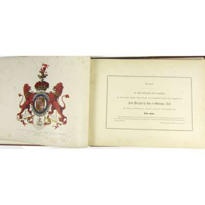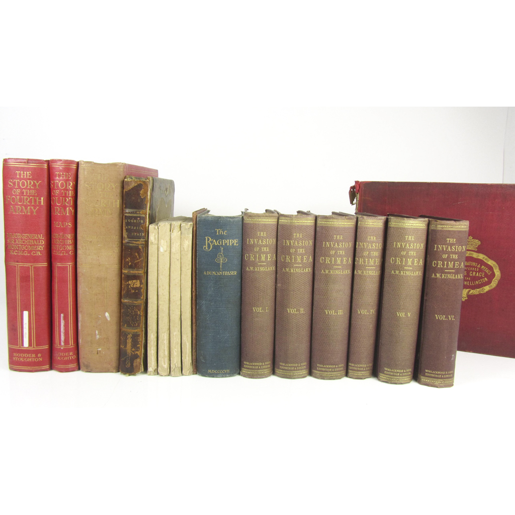 The Orders, Batons & Medals conferred on His Grace the Duke of Wellington. [No publisher, c.1850]. Oblong folio, 36 chromolithographed plates (counted in the pagination sequence), original red cloth, worn, lacking spine, Rare, without title; Murray, A.K. History of the Scottish Regiments of the British Army. Glasgow, 1892. 4 original parts, 8vo, 44 lithographed plates, most hand-coloured, original pictorial wrappers; Pattison, Lt. F.H. Personal Recollections of the WATERLOO Campaign. Glasgow: for Private Circulation, 1870. Presentation copy from the author, with signed photograph of the author tipped in, original cloth, slightly loose; [Gleig, George R.] The Campaigns of the British Army at Washington and New Orleans. 1836. Fourth edition, 8vo, upper board, lacks spine and lower board; Fraser, A.D. Some Reminiscences and The Bagpipe. 8vo, plates, original cloth; Montgomery, Sir A. The Story of the Fourth Army. 1919. 2 volumes including map volume, 19 folding maps, and 4 (of 7) folding panoramas; Kinglake, A.W. The Invasion of the Crimea. 1875. 6 volumes, 8vo, original cloth; Hay, Leith Memoirs of Lieutenant-General Sir James Leith. 1821. 8vo, half calf; [St. Helena] Manuscript transmitted from St. Helena, by an unknown channel. 1817. 8vo, contemporary half calf, slightly rubbed; Doyle, Arthur Conan The British Campaign in France and Flanders. 1918. 6 volumes, 8vo, maps and plans, original cloth; and c. 28 others (51)