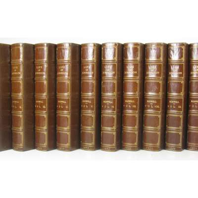 The Life of Samuel Johnson, edited by Clement Shorter. New York: G. Wells, 1922. 10 volumes, 8vo, number 268 of 785 copies, Temple Bar Edition, engraved plates, brown half morocco by C.J. Sawyer Ltd., spines gilt, a fine set