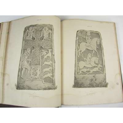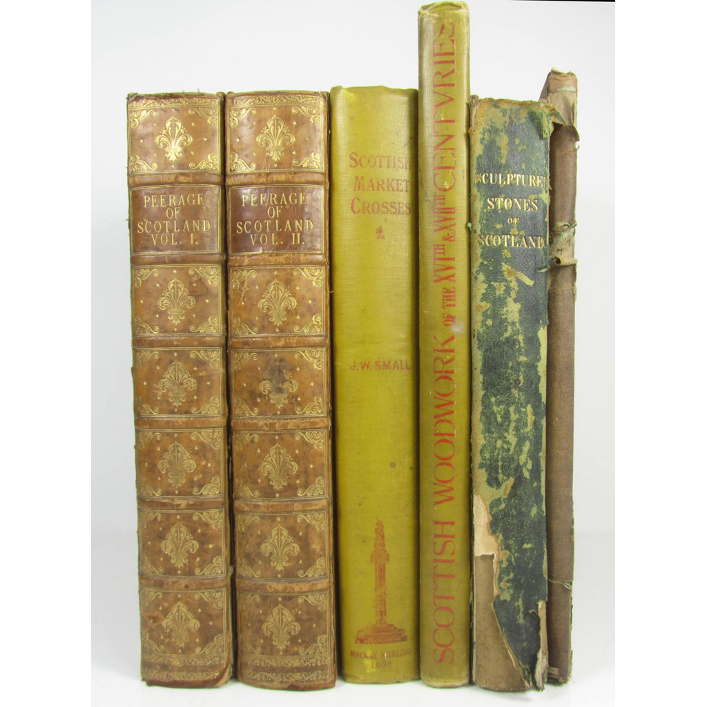 Sculptured Stones of Scotland. Aberdeen, 1856- Edinburgh, 1867. 2 volumes, folio, 138 and 37 lithographed plates, some coloured, original half morocco and original cloth, dampstaining, worn; Small, John W. Scottish Market Crosses. Stirling, 1900. Folio, plates, pictorial yellow buckram, t.e.g., binding dust-soiled; Small, John W. Scottish Woodwork of the Sixteenth & Seventeenth Centuries. Stirling, 1878. Folio, plates, pictorial yellow buckram, t.e.g., binding dust-soiled; Douglas, Sir Robert The Peerage of Scotland. Edinburgh, 1813. 2 volumes, folio, 17 engraved plates, contemporary calf, rubbed, joints split (6)