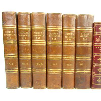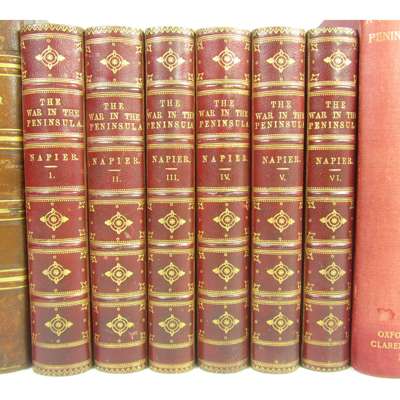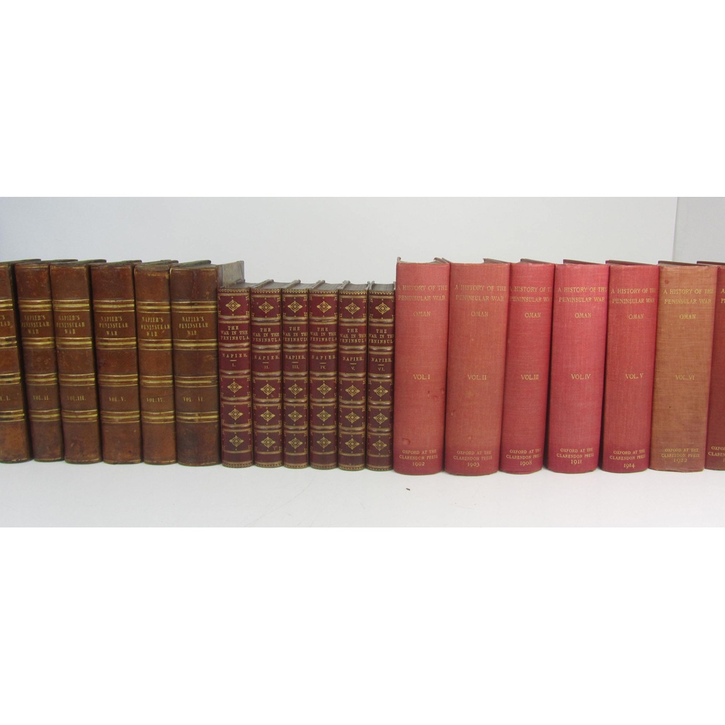 History of the War in the Peninsula. 1836. 6 volumes, 8vo, contemporary half morocco, head of one spine repaired; Napier, W.F.P. another edition. 1876. 6 volumes, 8vo, contemporary red half morocco, spines gilt; Oman, Charles A History of the Peninsular War. 1902. 7 volumes, 8vo, maps, some folding, original red cloth gilt (19)