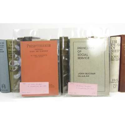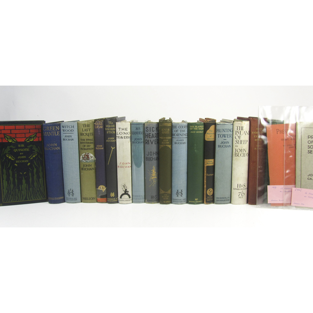 Sir Quixhote of the Moors. 1895, pictorial cloth; Scholar Gipsies. 1896. Second edition, A.L.S. from Anna Buchan to Mrs Geddes loosely inserted; Some Eighteenth Century Byways. 1908; Mr Standfast. 1909; Greenmantle, 1916; Huntingtower, 1922; The Last Secrets, 1923; Witchwood, 1927; The Courts of the Morning, 1929; The Blanket of the Dark, 1931; Julius Caesar, 1932, The Magic Walking-Stick, 1932; The Massacre of Glencoe. 1932, dustwrapper; The Free Fishers. 1934; Principles of Social Service. [1934], 8vo, original grey wrappers; The Island of Sheep. 1936, dustwrapper; Presbyterianism, yesterday, to-day and to-morrow. 1938, 8vo, original orange wrappers; The Long Traverse, 1941, dustwrapper; Sick Heart River. 1941, dustwrapper; all but the first First Editions, original cloth except where noted; and 2 later editions (21)