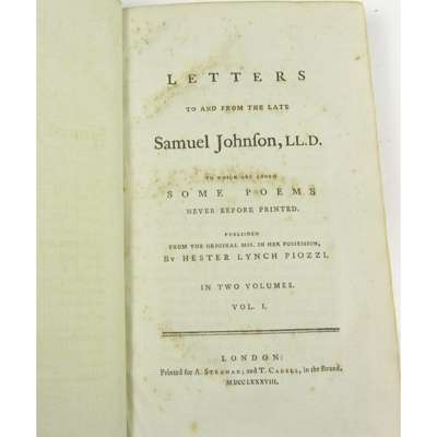 Letters to and from the late Samuel Johnson. London: A. Strahan & T. Cadell, 1788. First edition, 2 volumes, 8vo, errata slip in volume 2, contemporary calf, spines gilt, morocco labels, slightly spotted