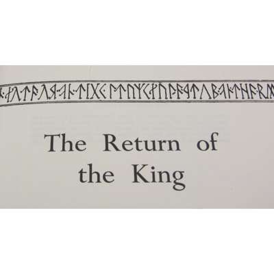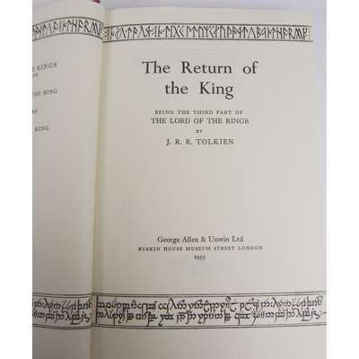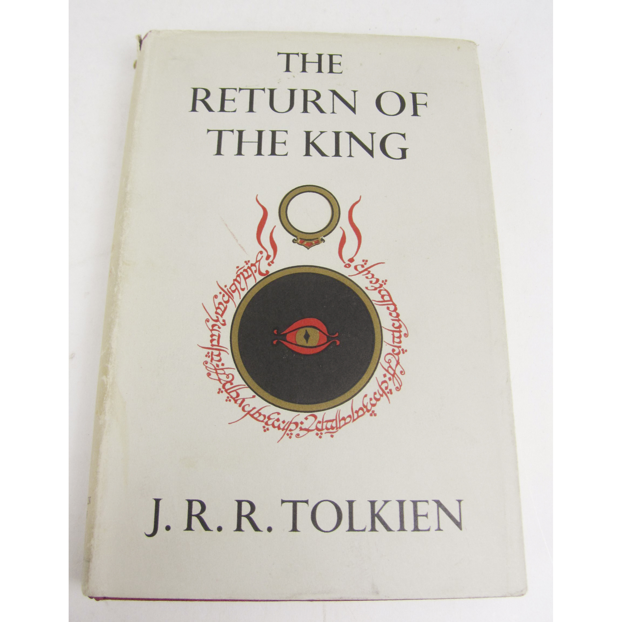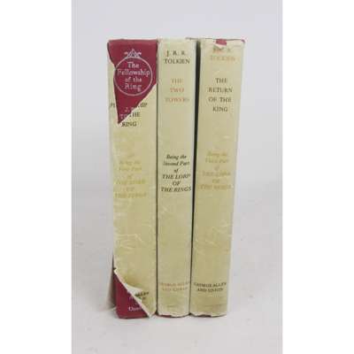 The Fellowship of the Ring. London: George Allen & Unwin Ltd, 1955. 8vo, fourth impression November 1955; The Two Towers. 1955, first edition, second impression; and the Return of the King. 1955, first edition, 3 folding maps, original crimson cloth, dust-jackets, not price clipped, slight tear to head of the title page of Return of the King not affecting print, some discolouration to the spines of dust-jackets with some slight wear to head and foot of spines (with notable loss to The Fellowship of the Ring wrapper and some soiling) (3)
