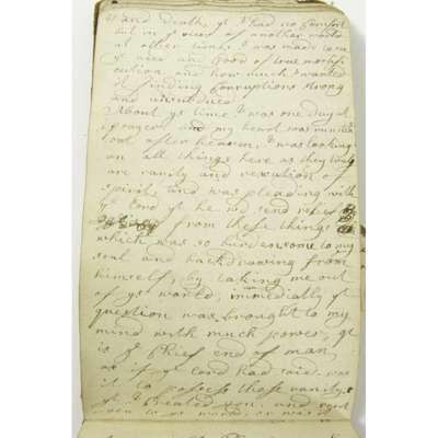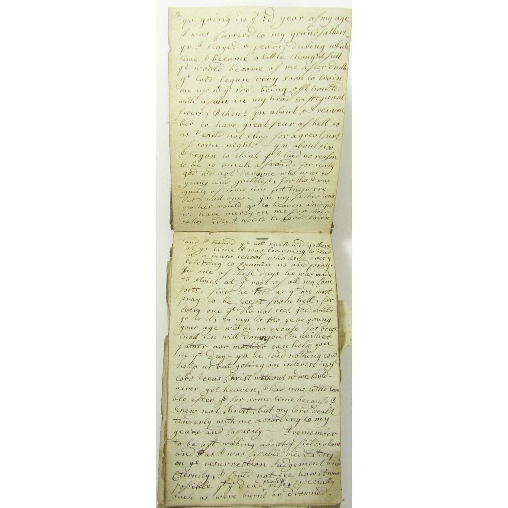 "I was a blasphemer but I obtained mercy, ye following account I have set down for a help to my own ill memory least I should forget ye goodness of God..." "My schoolteacher" first told us that we must pray to be kept from hell, for every one that did not seek god would go to it, & says though ye be young your age will be no excuse for original sin will damn you, & neither father no mother can help you in that day... I had some little trouble after that for some time because I knew not Christ, but my Lord dealt tenderly with me according to my years and capacity...", commencing with early sins (stealing some amber beads belonging to a servant), referring to King William's death 21 I was in great trouble with fear of persecution", 158 pages, 15 x 9.5 cm., calf, a few pages loose and inserted, referring to the Highlands, Edinburgh, c. 1708