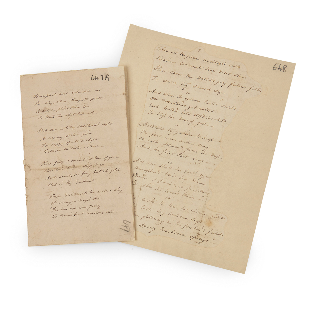 To the Rainbow, autograph manuscript draft of Campbell's poem, comprising 18 four-line stanzas, including two verses which appear to have been deleted, written on two sheets of paper (18.3 x 20.3 and 20.4 x 18.2 cm respectively), extensively but very neatly repaired; also with a group of seven letters to Campbell from various senders: Thomas Moore declining a proposal for editorial collaboration, owing to a lack of time; two from Thomas Telford; one from Joanna Baillie; one from R.L. Edgeworth; one from Francis Jeffrey; and one from James Smith; also including two address wrappers and two invitation cards, 1810-1830; Thomas Campbell ALS to Mr Stevenson, dated 28 May 1806 (13)