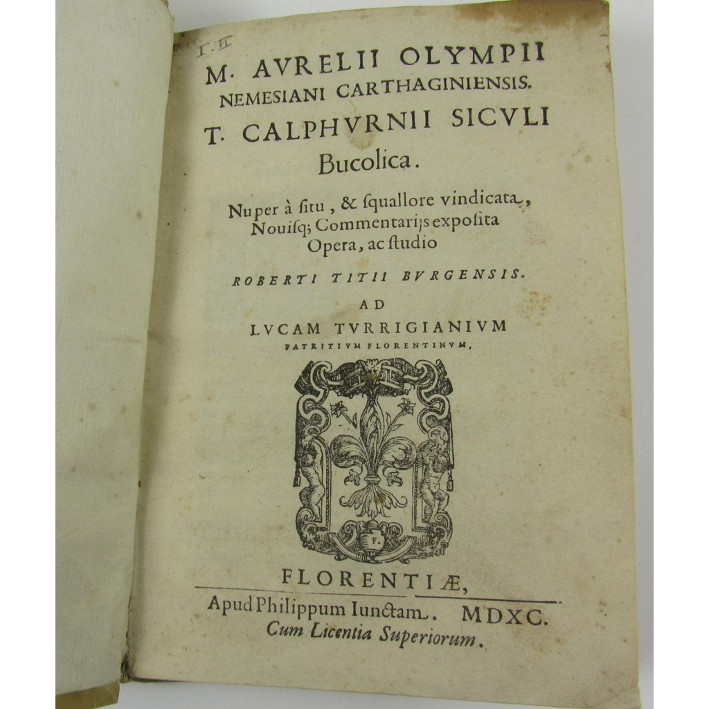 Bucolica. Florence: Giunta, 1590. 4to., woodcut device on title and verso of final leaf CC4, contemporary vellum