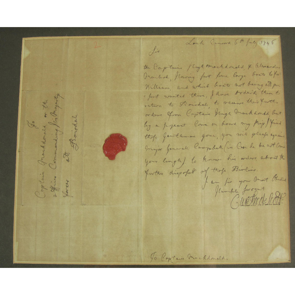 Letter dated 6th July 1746, from Loch Einnord, signed Fred[?] Scott, informing Captains Hugh Mackdonald [sic.] and Alexander Macleod that the sender sent ships to Fort William but, as they were not wanted there, he ordered them to be sent to Boisdale and asking Captain MacDonald what he would like done with them, 23 x 18.5 cm, framed and glazed, some browning