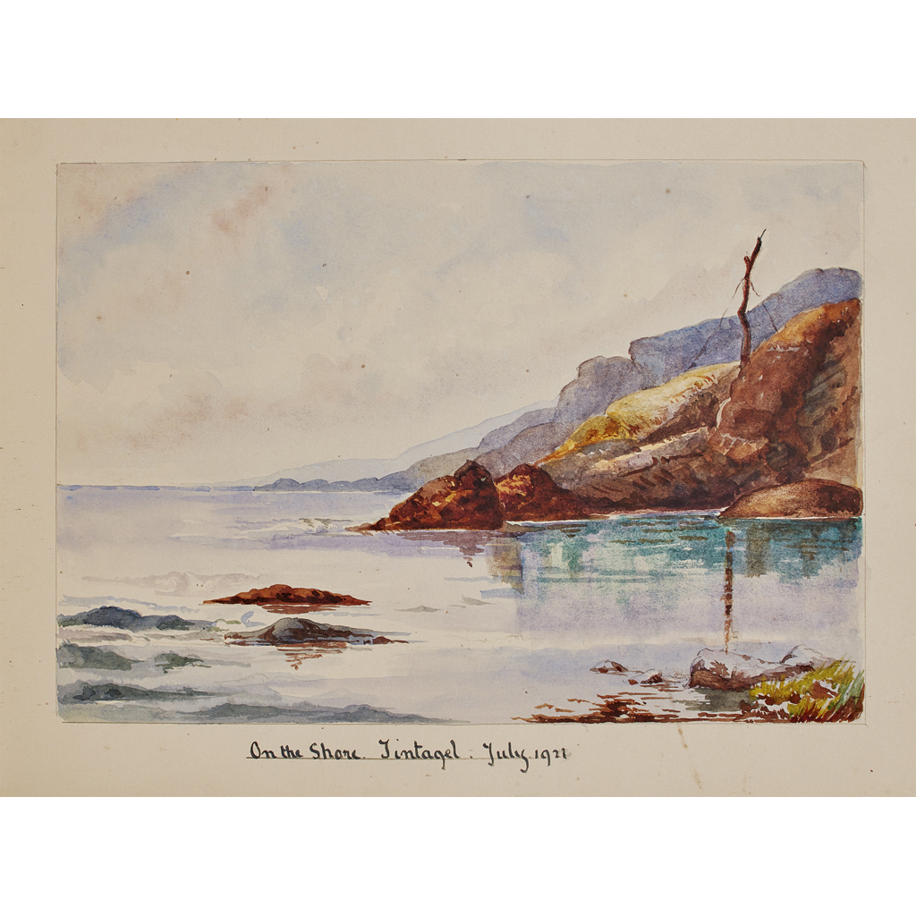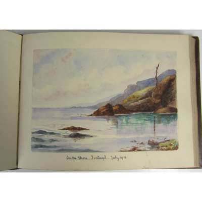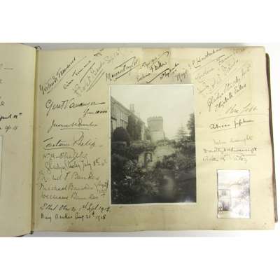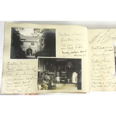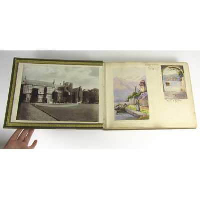 Brown morocco album by Bumpus Ltd., Oxford with 'FLORRIE' stamped in gilt to upper cover, c.35 x 26.5 cm, photograph of Wolfeton House, Dorset, to front endpaper, with 3pp. of guest autographs from 1915, and later from 1955, many photographs and a large number of watercolour scenes, covering Lago d'Orta, Italy, Ackergill in Wick, Eilean Donan, Loch Etive, Glenfinnan, Gruinard Bay, Tarbert, Loch Fyne, Tintagel, Lago Maggiore, mostly dating between 1915 and 1924, contains 79 full-page watercolours, and several smaller