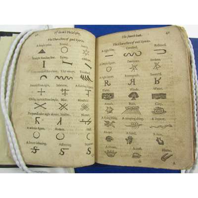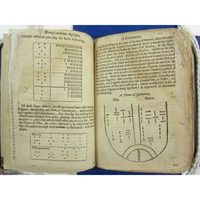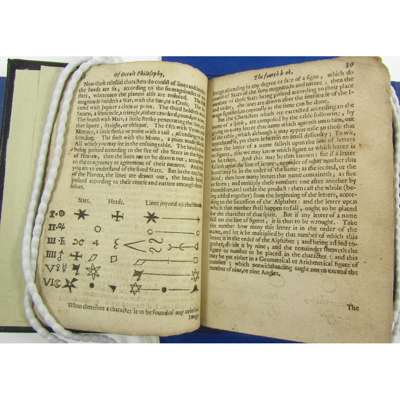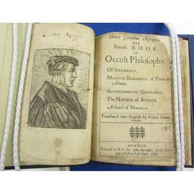 His Fourth Book of Occult Philosophy. London: J.C. for John Harrison, 1655. 4to, engraved frontispiece portrait, woodcuts, 2 pp. interesting annotated endpapers "1673/74, John Dewell his booke, Major Snow of Shey Hill, Stafford, gent", modern black morocco, blue cloth folding box, lacks E2-E3, 7 leaves repaired in fore-margin with loss of a few letters, some dampstaining, [ESTC R6621]
