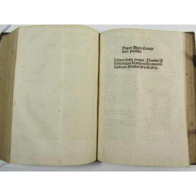 Super Matthei Evangeliare postilla [Bound with:] Super Marci Evangeliare postilla. Hagenau: expensis Joannis Rynman de Oringaw, industriii Henrici Gran, 16 April, 1505. 2 works in one volume, folio, [20]ff. (last blank), CCXIFF. [1]f. (blank); [6]ff. (last blank), XCIX (lacking final blank), mid 16th century blind-tooled pigskin over bevelled wooden boards, rebacked in the early 18th century in calf, gilt tooled in compartments, clasps and catches intact, a little stained on lower cover, rubbed, [Adams A548 and A548]