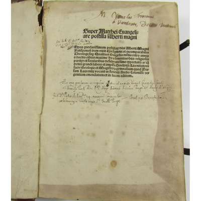 Note: An excellent copy of Albertus Magnus' critical commentaries on the Gospels of St. Matthew and St. Mark. In the previous year Rynman and Gran had published his commentaries to St. Luke and St. John. Albertus Magnus (?1206-1280), described as the most widely read and learned man of his time, was as much a philosopher and scientist as a theologian. His greatest achievement was to absorb and interpret the works of Aristotle for his age from the Latin translations and notes of the Arabian commentators. Rare.
