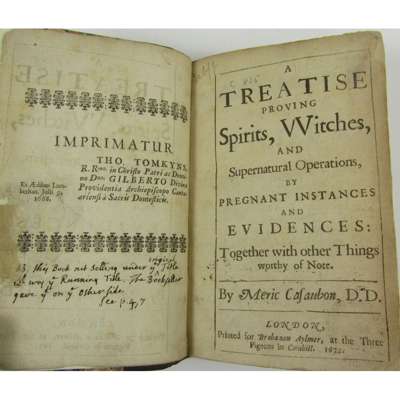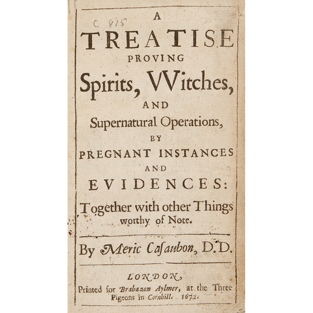 A Treatise proving Spirits, Witches, and Supernatural Operations, by pregnant instances and evidences... London: for Brabazon Aylmer, 1672. Second edition, 8vo, modern calf-backed marbled boards, contemporary annotation on license page, occasional minor corrections in the margin, small repair to A1, [Wing C815 [cf. C807]]