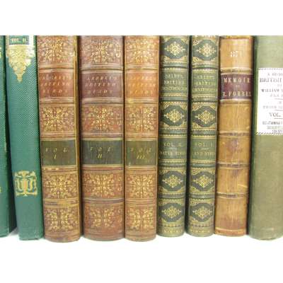 Illustrations of British Ornithology. Edinburgh, 1833. 2 volumes, 8vo, green half morocco gilt, g.e.; Yarrell, William A History of British Birds. 1843. 3 volumes, 8vo, illustrations, contemporary calf gilt; Yarrell, W. A History of British Birds. 1839. 3 volumes, 8vo, illustrations, original cloth, rubbed, one hinge split; Jardine, W. Lives of Eminent Naturalists. 1841. 8vo, plates, black half morocco; Wilson, G. Memoir of Edward Forbes. 1861. 8vo, frontispiece, contemporary half calf; Scoresby, W. The Northern Whale Fisher. [c.1849], 12mo, original cloth; Leslie, Professor Narrative of Discovery and Adventure in the Polar Seas and Regions. Edinburgh, 1830. 12mo, folding map, half calf, name excised from head of title, plates slightly dampstained; Hall, Basil Fragments of Voyages and Travels. Second Series. Edinburgh, 1832. 3 volumes, 8vo, engraved titles, later buckram; and 4 others (19)