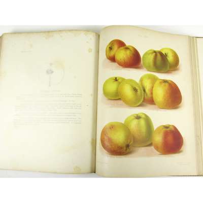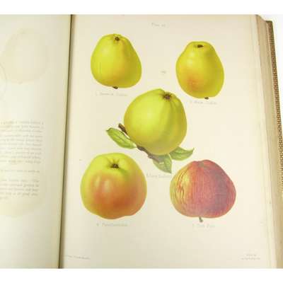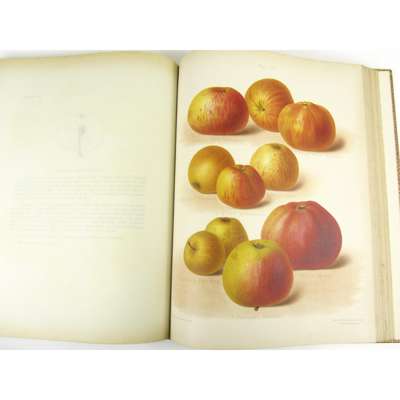 The Herefordshire Pomona... the illustrations drawn and coloured from nature by Miss Ellis and Miss Bull, general editor Henry Graves Bull. London: Hardwicke & Bogue; Hereford: Jakeman and Carver, 1876-85. 2 volumes, 4to., presentation copy from Dr Bull to J. Dennis Esq., original upper wrapper to parts 1 & 2 bound in, 75 (of 77) chromolithographed plates, (lacks plates 3 & 46), 4 uncoloured plates, contemporary red morocco gilt, spines gilt, gilt edges, sides very slightly marked and with a few minute nicks, slightly spotted, tissue guards quite spotted
