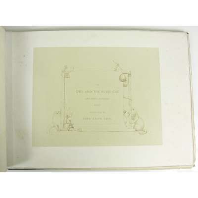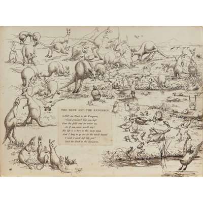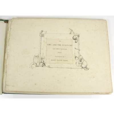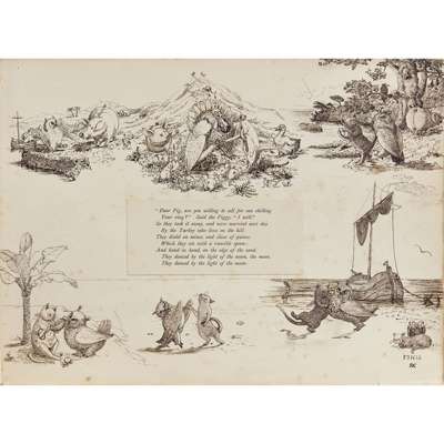 The Owl and The Pussy-Cat 4 leaves of original pen and ink illustrations by Lord Ralph Kerr, two with his monogram to the lower right corner of each plate, with the printed text of the poem laid-down to the centre of each plate; The Duck and the Kangaroo 4 leaves of original pen and ink illustrations by Lord Ralph Kerr, two with his monogram in the lower left corner of each plate, with the printed text of the poem laid-down to the centre of each plate; Original drawing for the title-page for Lear's The Owl and the Pussy-Cat and Other Nonsense Songs, again with printed text laid-down to centre; each 26.5 x 36.5 cm; Lear, Edward The Owl and the Pussy-Cat and Other Nonsense Songs. [Cundall and Co., 1872]. Oblong 4to, 12 mounted albumen prints from Kerr's illustrations, all pages loose