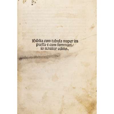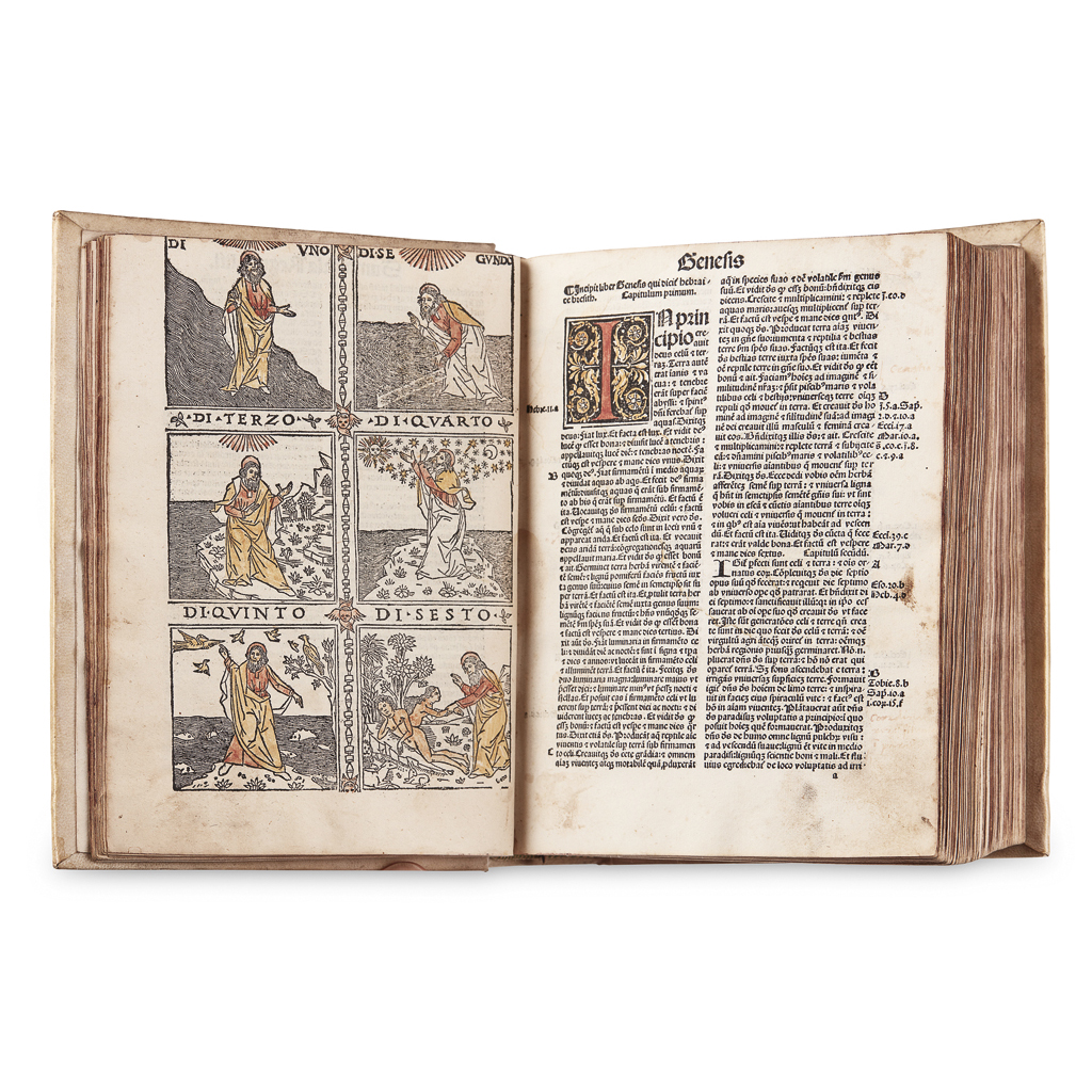 Biblia, cum tabula nuper impressa [et] cum summariis noviter editis. Impressum Venetijs : P[er] Symonem dictu[m] Beuilaqua, 1498, die octauo Maij [Venice: Simon Bevilaqua, 8 May 1498]. 4to., (205 x 151mm.), 528 leaves, 51 lines and headline, Gothic letter, printed in double columns, 73 woodcuts, woodcut initials, large woodcut printer's device on verso of final leaf, 19th century vellum gilt, red morocco lettering piece, ownership inscription deleted from title, very small holes to extreme upper margin of title and to fore-margin of final leaf (not affecting text), large woodcut on verso of a10v partly hand-coloured, a few leaves lightly dampstained, mainly marginal