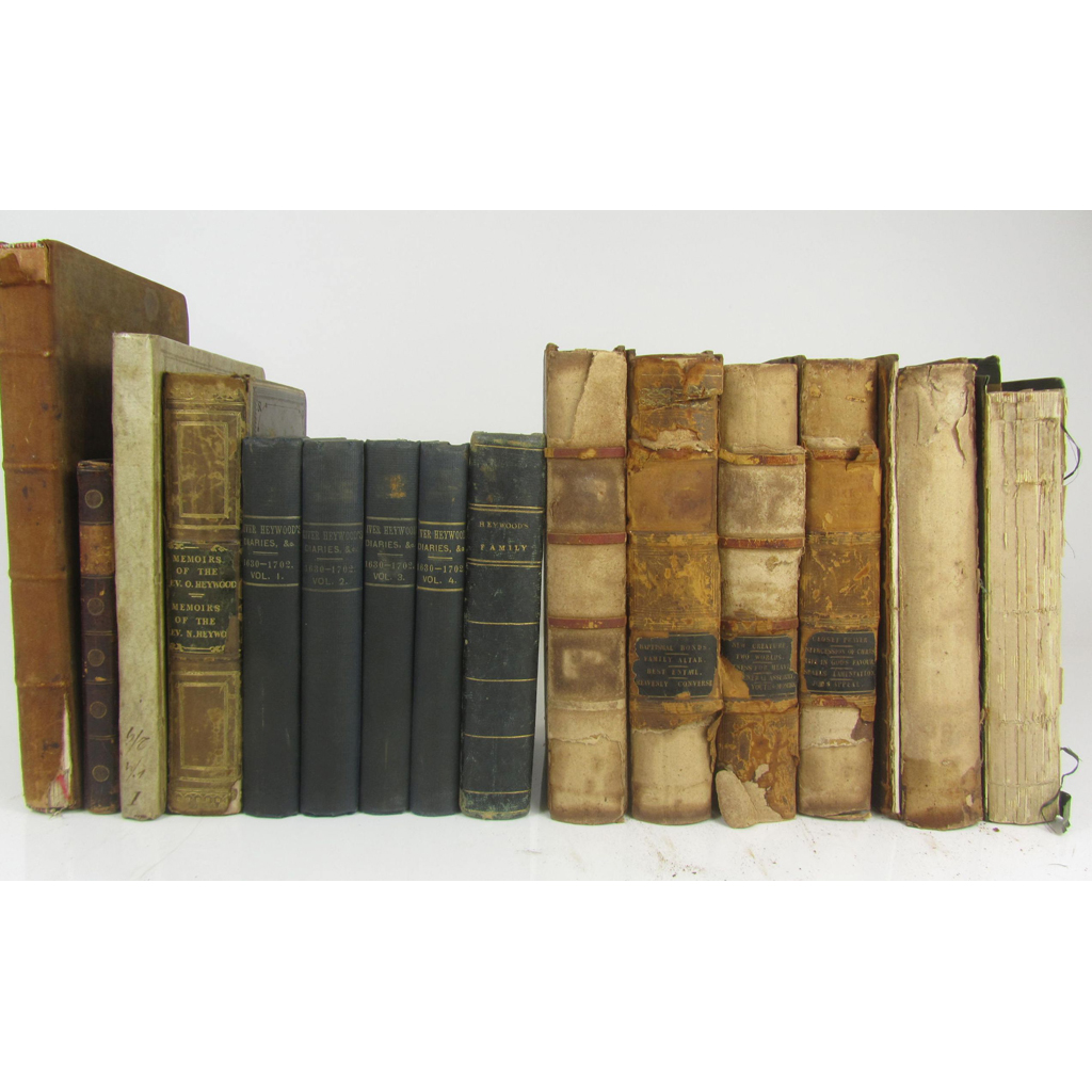 The Whole Works. Idle, 1827. 5 volumes, frontispiece, half calf, worn, covers detached; Memoirs. Idle, 1827; Heywood, N. Memoirs. Idle, 1827, calf, hinge broken; Fawcett, J. The Life of the Rev. Oliver Heywood. Ewood Hall, Halifax Hall, [c.1790], 8vo, calf, rubbed; Manuscript Account Book of Samuel Heywood, 1786-89, probably when Town Clerk of Nottingham, bookplate of S. Heywood, reversed calf; Heywood, Rev. Oliver His Autobiography, Diaries &c., Brighouse, 1882-85. 4 volumes, 8vo, original cloth; Heywood family - Manuscript Manuscript copy book recording letters sent c. 1760-98 by members of the Heywood and Astley families, blue morocco, armorial bookplate of Richard Astley; Hunter, J. The Rise of the Old Dissent, exemplified in the Life of Oliver Heywood. 1842. 8vo, frontispiece, spine and covers detached; and 1 other (14)