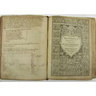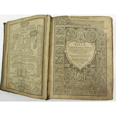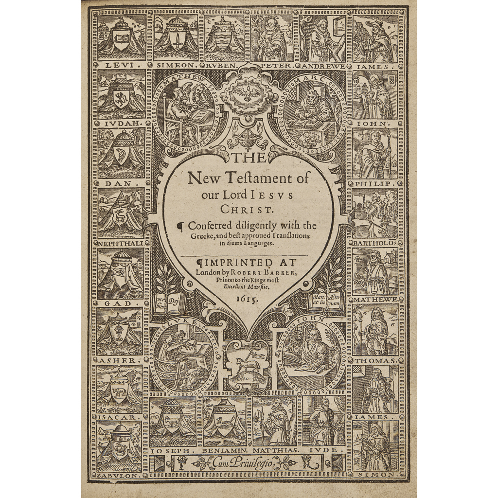 The Bible. London: Robert Barker, 1615. Large 8vo, general title with some loss to upper part, R3-R5 slightly frayed, small tear to Q3 repaired, occasional early marginal annotations, occasional dampstain, minor soiling or spotting, KK1-8 loose & slightly frayed, [ESTC S102002 ; STC (2nd ed.), 2241]; bound with Two right profitable and fruitful Concordances. Robert Barker, 1616; The Whole Book of Psalmes, 1616, ?lacking G6-8; Morning Prayer, lacking A1; Genealogies, contemporary panelled calf, cloth slipcase, corners and edges neatly repaired