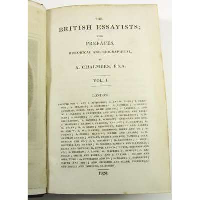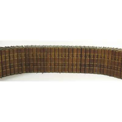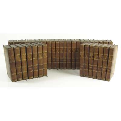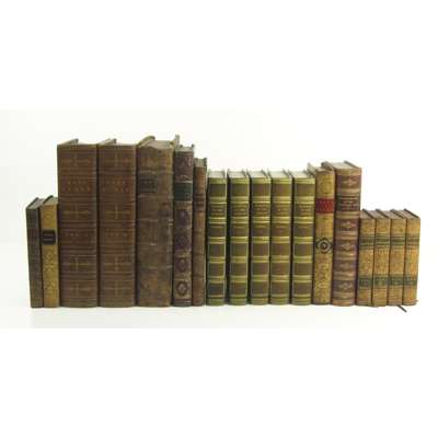 The British Essayists. London: C. and J. Rivington..., 1823. 38 volumes, 12mo, contemporary half calf with tooling in gilt and blind, bookplates; Cruden, Alexander A Complete Concordance to the Holy Scriptures... London: D. Midwinter, 1738. 4to,contemporary calf, upper cover detached, worn; Browne, Isaac Hawkins Poems Upon Various Subjects... London: J. Nourse, 1768. 8vo, portrait, contemporary calf gilt; Holy Bible The Holy Bible, ornamented with engravings by James Fittler... London: R. Bowyer, 1795. 2 volumes, 4to, contemporary calf with tooling in gilt and blind, a.e.g., upper board to volume becoming detached; [Bartlett, W.H.] Forty days in the Desert... London: Arthur Hall & Co., [n.d. but 1850?] Fifth edition, 8vo, contemporary half calf gilt; Maxwell, Sir Herbert Memories of the Months. London: Edward Arnold, 1910-1912-1903-1907-1909. 5 volumes, mixed edition, uniformly bound in half green morocco gilt, spines faded; and 8 others, sold not subject to return (56)