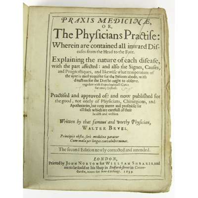 Praxis Medicine, or The Physicians Practise... London: William Sheares, 1639. Second edition, small 4to, contemporary vellum, text-block detached [ESTC S105948]