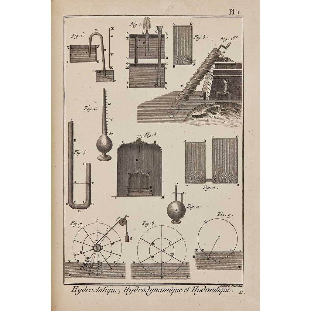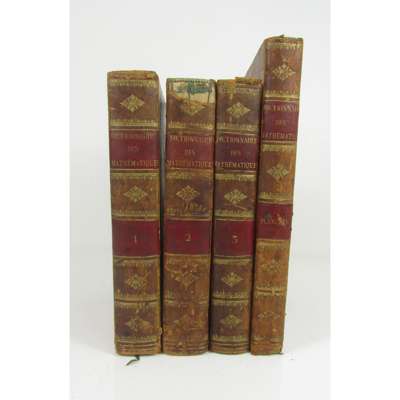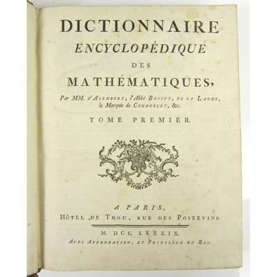 Dictionnaire Encyclopédique des Mathématiques... Paris: Hôtel de Thou, 1789. 4 volumes, 4to, 108 engraved plates (some double-page), contemporary tree-grained sheep with red morocco gilt labels to spines, repair to 1 plate, a little rubbing to covers, volume 2 lacking head of spine (4)