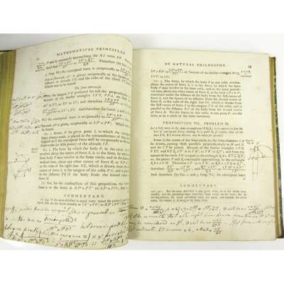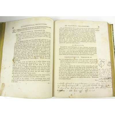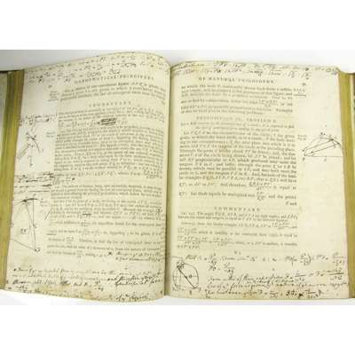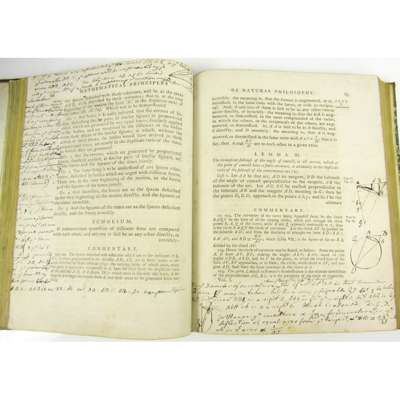 Mathematical Principles of Natural Philosophy. Translated into English with a Commentary by Robert Thorp, M.A. London: W. Strahan & T. Cadell, 1777. First edition, Volume 1 (all published), 4to., [10], xv-lviii, [2], 360; the translator Robert Thorp's copy, with his name on title, EXTENSIVELY ANNOTATED BY THE TRANSLATOR ROBERT THORP IN THE MARGINS, AND WITH DIAGRAMS, bound without the plates, early 19th century half calf, lettered "Thorp's Newton", spine gilt