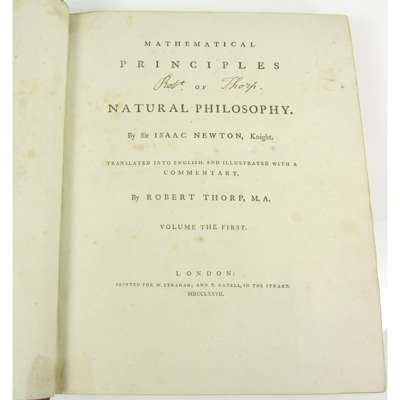 Note: The translator's own extensively annotated edition of his translation of volume 1 of Newton's Mathematical Principles of Natural Philosophy. Robert Thorp, 1736-1812, attended Durham School and Peterhouse College, Cambridge, obtaining a B.A. as Senior Wrangler in 1758 and an M.A. in 1761. In 1768 he succeeded his father Thomas Thorp (1699–1767) as rector of Chillingham; in 1782 he became rector of Gateshead; in 1792 Archdeacon of Northumberland. In 1795, he became rector of Ryton, and was a founder of Durham University. As well his translation of Newton he was the author of Excerpta quædam e Newtoni Principiis Philosophiæ Naturalis, 1765.