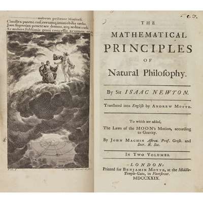 Sir Isaac Newton's Mathematical Principles of Natural Philosophy and his System of the World, translated into English by Andrew Motte. To which is added The Laws of the Moon's Motion according to Gravity [by J. Machin]. London: Benjamin Motte, 1729. First English edition, 2 volumes, 8vo, 2 frontispieces, 47 folding plates and 2 folding tables, good quality facsimile title-page to volume 2, contemporary calf, volume 1 with gilt tooled border, with renewed red morocco gilt labels to spines, gilt tooling to spines, previous ownership signature to endpapers in volume 1, some minor marginal worming in both volumes with discreet repairs to final pages and plate in volume 1, some slight, occasional soiling in both volumes, a few minor marginal tears to volume 2, some marginal staining to initial 108 pages in volume 2, a few neat repairs to bindings, a little rubbing, lower joint on volume 1 splitting slightly [ESTC T142590, Babson 20] (2)