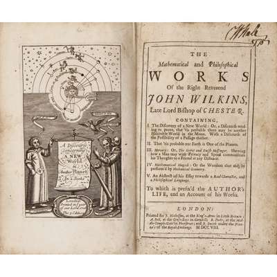 The Mathematical and Philosophical Works... London: J. Nicholson..., 1708. 8vo, first collected edition of Wilkins's works, engraved title, lacking portrait, contemporary panelled calf, a little spotting and soiling throughout, covers a little rubbed and chipped [ESTC T110678]