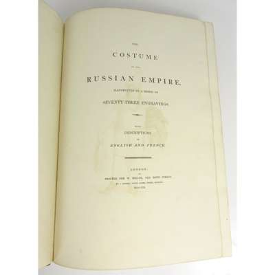 The Costume of the Russian Empire. London: W. Miller, 1803. Folio, 73 hand-coloured plates, red morocco gilt, bookplate of Helen Viscountess D'Abernon