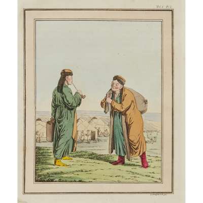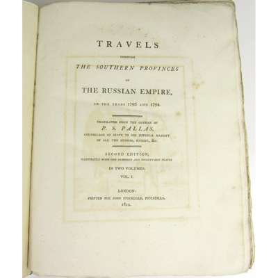 Travels through the Southern Provinces of the Russian Empire. Piccadilly: John Stockdale, 1812. 2 volumes, second edition, 4to, 51 (of 52) plates, mostly hand-coloured (plate 4 in volume 2 is lacking), 3 folding maps, vignettes mostly hand-coloured, original boards with paper labels to cloth spines, some plates worn, a little soiling, 'Methven Castle' written to upper boards (2)