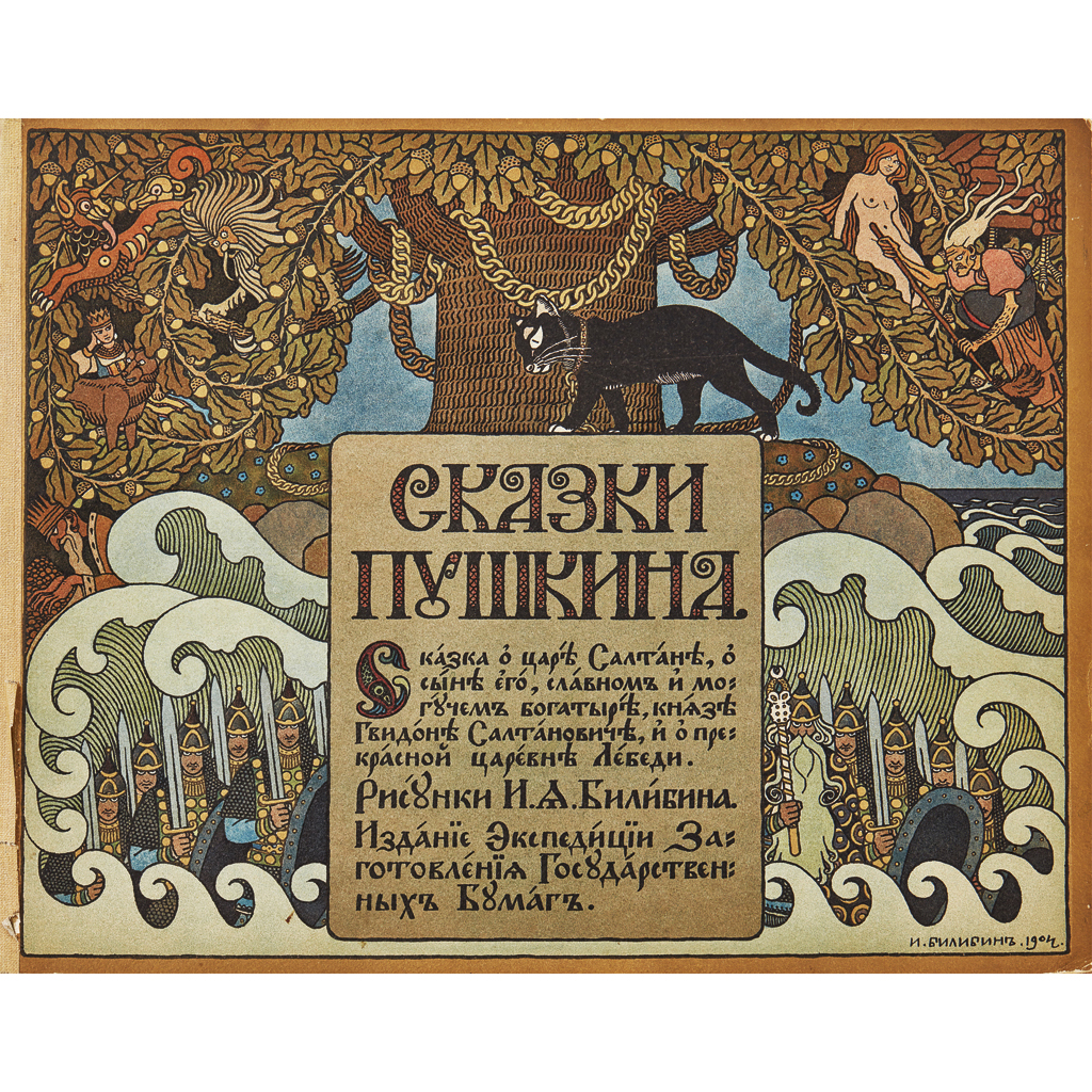 Skazka O Tsarie Saltane [The tale of the Tsar Saltan...] St Petersburg: Expeditsii Zagotovlenya Gosudarstvennykh Bumag, 1905. Oblong 4to, chromolithographed boards and pages by Bilibin, tissue guards; and another copy; and a later English translation (3)