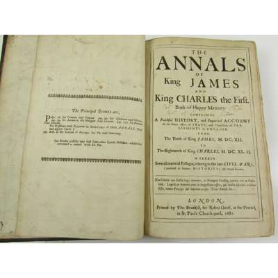 The Annals of King James and King Charles the First. London: Robert Clavel, 1681. Folio, contemporary calf, neatly rebacked, corners repaired, slight worming at end affecting a few words from p.833, [ESTC R4480]