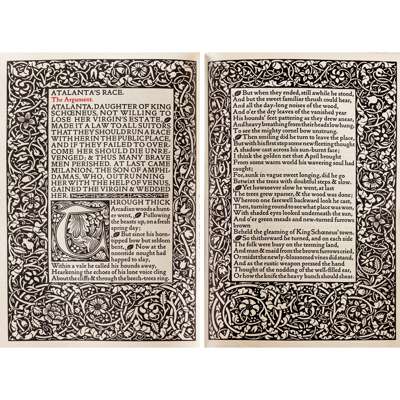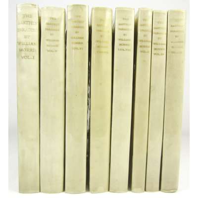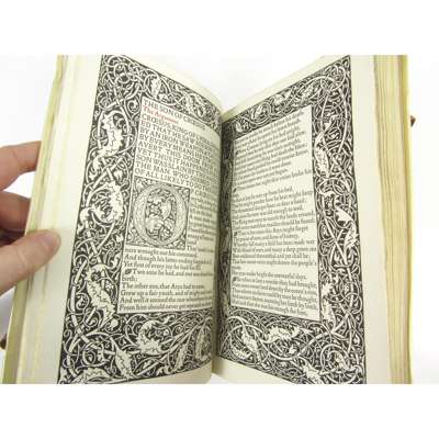 The Earthly Paradise. Hammersmith: Kelmscott Press, 1896-97. 8 volumes, 4to., one of 225 copies, printed in red and black, wood-engraved borders and initials designed by Morris and R. Catterson-Smith, original limp vellum with ties, uncut, [Peterson A41]