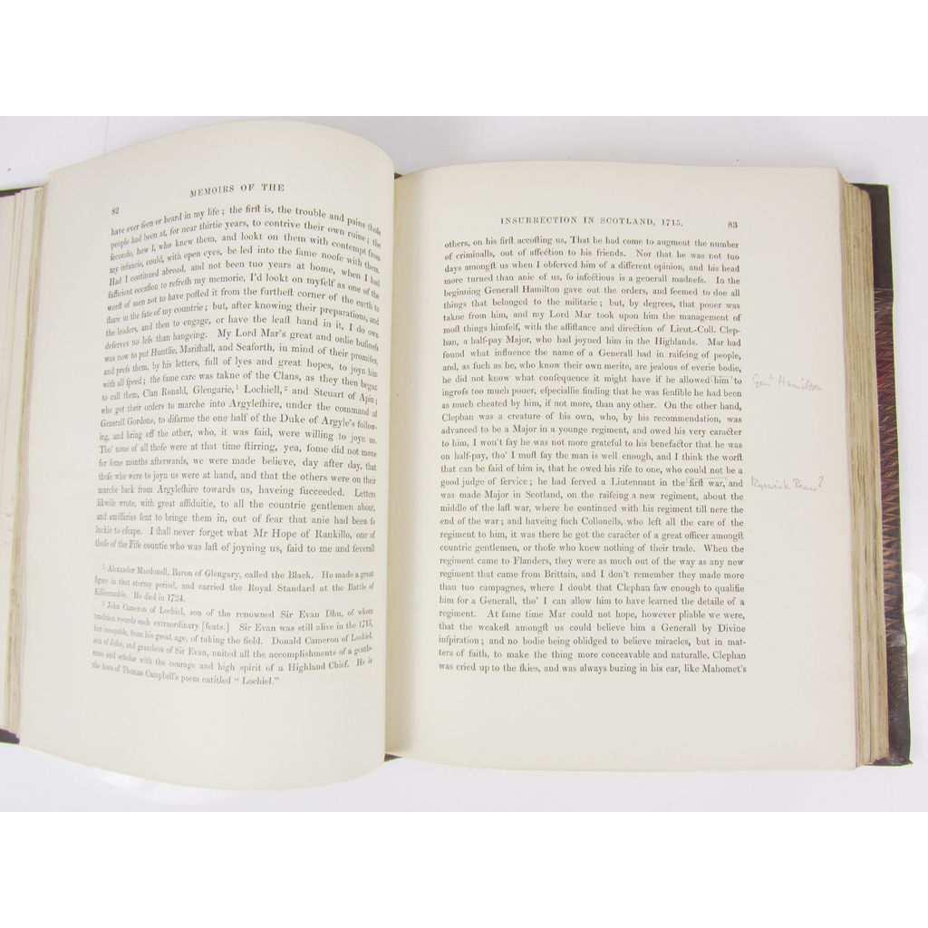 Memoirs of the Insurrection in Scotland in 1715. Edinburgh: [Abbotsford Club], 1858. 4to, endpaper inscribed "T. Carlyle, Chelsea, 1860" in ink, c. 12 pages with brief annotation or comments in pencil, in Carlyle's hand, brown half morocco with crested "L" to head of spine, bookplate of the Marquis of Lothian
