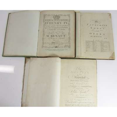 IV Sonates pour le pianoforte. (Oeuvres complettes, volume 7). Leipzig: Magasin de Musique de Breitkopf et Hartel, [1801]. Oblong 4to; half morocco, worn; Kollmann, A.F.C. A Practical Guide to Thorough Bass. London, 1801. 4to, 68pp., worn wrappers; Bach, J.C. Six Overtures in eight parts, Opera III. London: Welcker, [1765], Violino Primo part only, bound with others by Gaetano Pugnani and John Garth, half calf; The Favourite Songs in the Opera Didone. London: R. Bremner, [n.d.]; Benaut, M. Entr'acte et ronde D'Henry IV. Paris: chez l'auteur/Mlle. Castagnery; Cesar, P.A.) Ouvertures des trois fermiers. Paris: Frere, [n.d.]; Lapis, Santo Al Merito Singolare di Milord Robert Darcy. The Hague, 1743. Oblong 4to, marbled boards; Mozart, W.A. Grande Sonate a 4 mains, arrangée part C.F. Ebers. Nro: 1. Bonn: Simrock, [c.1818], & others, similar, chiefly early 19th century