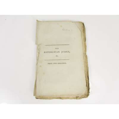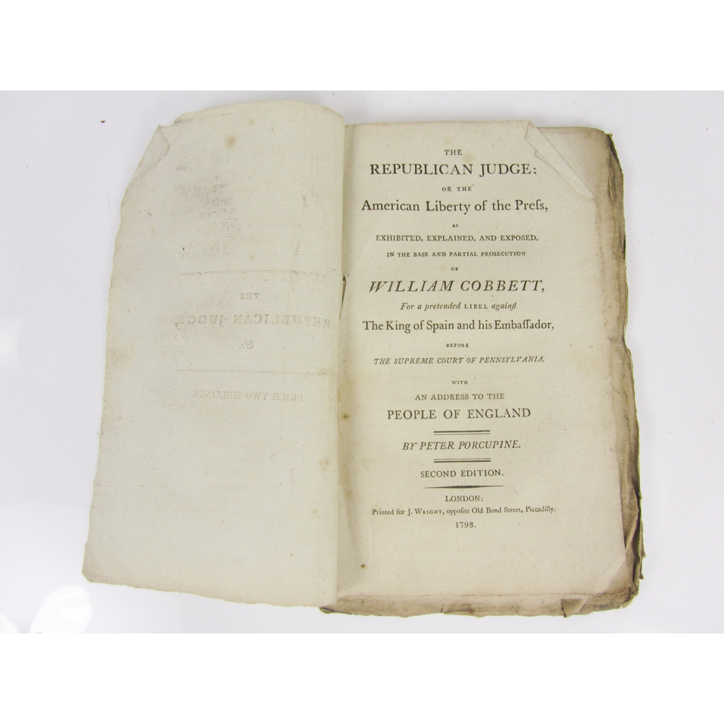 The Republican Judge: or the American Liberty of the Press, as exhibited, explained, and exposed in the base and partial prosecution of William Cobbett... before the Supreme Court of Pennsylvania. London: J. Wright, 1798. Second edition, 8vo, half-title, advertisement at end, [ESTC T13713], lacks wrappers, uncut, some fore-margins dust soiled