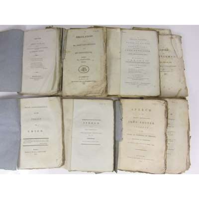 or the Policy of Union. Dublin: J. Milliken, 1800, original wrappers, uncut; Piers, Henry Collectanea de Rebus Hibernicis. Number 1. A Chorographical Description of the County of West-Meath. Dublin 1770, original wrappers, worn; [Castelreagh, Lord Viscount] The Speech.. upon delivering... his Excellency the Lord Lieutenant's Message on the Subject of an Incorporating Union with Great Britain. Dublin, 1800, original wrappers, uncut; Feagan, Murtagh A Letter from Murtagh Feagan... in answer to Darby Tracy. Dublin, 1800, original wrappers, uncut, spotted, worn; Earl of Clare, John The Speech... in the House of Lords of Ireland on a motion made by him. Dublin, 1800, sewn as issued, uncut, 2 copies; Pitt, William The Speech... in the British House of Commons on Thursday, January 31, 1799, Dublin, 1799, sewn as issued; [Cobbett, William] Detection of a Conspiracy formed by the United Irishmen. Dublin: J. Milliken, 1799, original wrappers, uncut, slightly stained; Minto, Lord The Speech of Lord Minto... resolutions ... respecting an Union between Great Britain and Ireland. Dublin: J. Exhaw, 1799, sewn as issued, uncut; [Musgrave, Sir Richard] A Concise Account of the Material Events and Atrocities which occurred in the late Rebellion. Third edition. Dublin: J. Milliken & J. Wright, 1799, sewn as issued, uncut; Grattan, Henry An Answer to a Pamphlet, entitled, the Speech of the Earl of Clare on the Subject of a Legislative Union between Great Britain and Ireland. Dublin: J. Moore, 1800, original wrappers, uncut; Smith, William Letter to Henry Grattan. Dublin: Marchbank, 1800, Third edition, original wrappers, uncut; Douglas, Sylvester Speech.. on Seconding the Motion... relative to a Union with Ireland. Dublin: J. Milliken, 1799, sewn as issued, uncut; " A Highlander" A Letter to Thomas Payne Esq., written in consequence of the one lately addressed by him to Mr Secretary Dundas. Edinburgh: W. Creech, 1792, original wrappers, uncut; Forster, John Speech of the Right Honorable John Foster. Dublin: J. Moore, 1799, lacking lower wrapper, uncut; Dundas, Right Hon. Henry Substance of the Speech.. in the House of Commons. Dublin: J. Exshaw, 1799, sewn as issued, a bit soiled; Peel, Robert The substance of the Speech... respecting an Incorporate Union with Ireland. Dublin: J. Exshaw, 1799, sewn as issued, kind regards; Addington, Henry Substance of the Speech... in the Committee of the Whole House. Dublin: J. Milliken, 1799, stitching perished, uncut; Auckland, Lord Substance of the Speech... Basis of an Union between Great Britain and Ireland. Dublin: J. Milliken, 1799, sewn as issued, uncut; "A Barrister" Speculations on Mr Grattan's Address to his Constituents. Dublin: J. Rea, 1797, original wrappers, uncut, lacks errata leaf, some spotting; Giffard, John Orange: a Political Rhapsody. Dublin 1798. Cantos 1-3, 3 volumes, Cantos 1-2 original wrappers, Canto 3 lacking upper wrapper, uncut; Butler, Charles A Letter to a Nobleman, on the Proposed Repeal of the Penal Laws. London, [c.1801], lacks wrappers, uncut, slight soiling; Dillon, Henry A. Short View of the Catholic Question. London: J. Debrett, 1801, lacks wrappers, soiling at ends; Foster, John Misconception of Facts and Mistatements of the Public Accounts. Dublin: J. Milliken, 1800, lacks wrappers, uncut; [Anon.] A Letter to His Grace the Duke of Portland, on the subject of Catholic Emancipation in Ireland. By a Gentleman. London, 1801, uncut, lacks wrappers