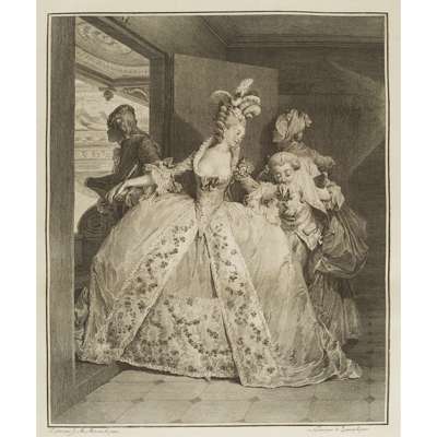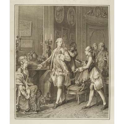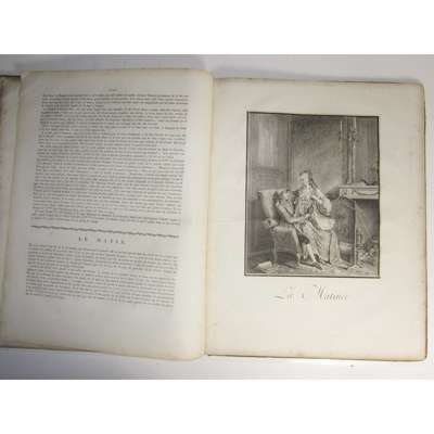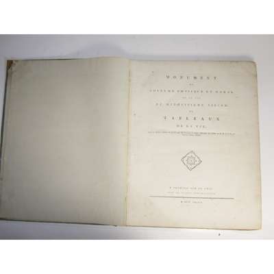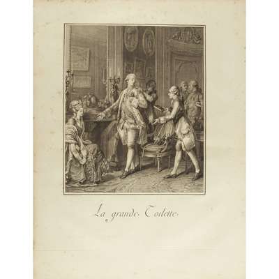 Monument du Costume Physique et Moral de la fin du Dix-Huitieme Siecle, ou Tableaux de la Vie, ornés de figures dessinées & gravées par M. Moreau le Jeune. Neuwied sur le Rhin: Chez la Société Typographique, 1789. First edition, folio, 26 engraved plates by Moreau le Jeune & Freudeberg, contemporary half calf, worn, (20 text leaves including title), light scattered spotting, upper board detached