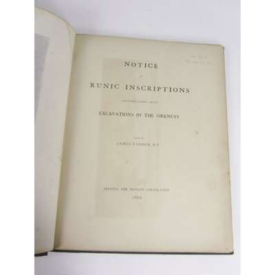 [Maes-Howe] Notice of Runic Inscriptions Discovered During Recent Excavations in the Orkneys. [Edinburgh: printed by R. & R. Clark for private circulation], 1862. 4to, inscribed and signed from the author to Mr Balfour on half-title, 13 plates, original blue cloth gilt, J. Robertson bookplate, some light browning, covers slightly scuffed