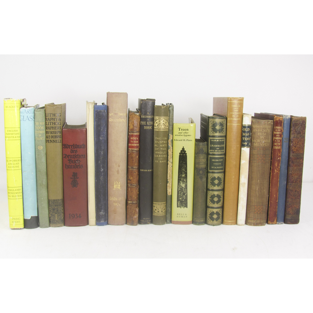 Maclehose, James, printer Pictures Exhibited in the Royal Reception Rooms in the Art Galleries of the Glasgow International Exhibition 1901. Glasgow, 1902. 4to, two bookplates designed by D.Y. Cameron belonging to J. Craig Annan and Lessing and Edith Rosenwald (loose), original boards with blue morocco gilt labels; "Bromley, Henry" A Catalogue of Engraved British Portraits. London: T. Payne..., 1793. 4to, contemporary tree calf, rebacked, bookplate; Almack, Edward A Bibliography of the King's Book or Eikon Basilike. London: Blades, East & Blades, 1896. Folio, original black cloth gilt, bookplate; Partridge, Frank Ralph Wood Pottery, Mr. Frank Partridge's Collection. London: [n.d.] 4to, original blue cloth gilt; Menpes, Mortimer Whistler as I knew Him. London: Adam and Charles Black, 1904. 4to, original cloth gilt; Huth, Henry A Catalogue of Woodcuts and Engravings in the Huth Library. London: Chiswick Press, 1910. 4to, contemporary quarter morocco, bookplate; Gebelin, François Les Chateaux de la Renaissance. Paris, [1927]. Folio, original cloth; Blanc, Charles Grammaire des Arts Décoratifs. Paris, 1882. 4to, contemporary quarter morocco gilt; Trusler, John The Works of William Hogarth. London: Jones and Co., 1833. 4to, contemporary half calf; Field, George A Grammar of Colouring... London: Crosby Lockwood & Co., 1877. 12mo, original cloth; and 14 others, sold not subject to return (24)
