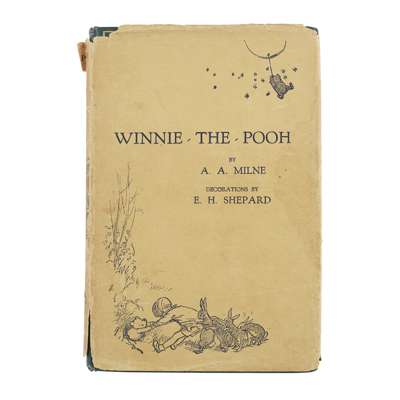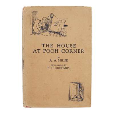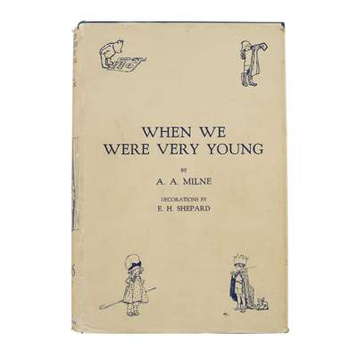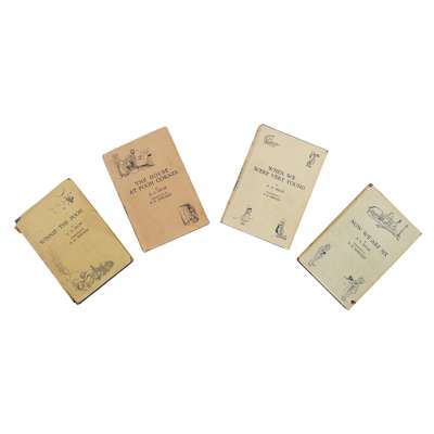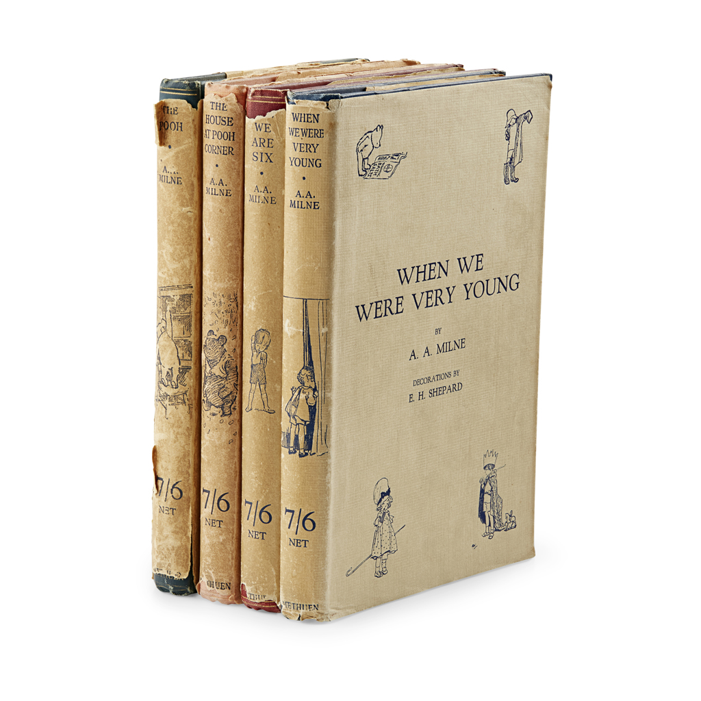 When We Were Very Young. London: Methuen & Co., 1925. Tenth edition, 8vo, original blue cloth gilt, dust-jacket a little chipped, offsetting onto endpapers; [Idem] Winnie-the-Pooh. London: Methuen & Co., 1926. First edition, '117th thousand' to rear flap of dust-jacket, 8vo, original green cloth gilt, a little spotting, especially to final leaves, some light dampstaining to covers, dust-jacket with chips, tears and a little water damage; [Idem] Now We are Six. London: Methuen & Co., 1927. First edition, 8vo, original red cloth gilt, dust-jacket with a few tears and some darkening to spine, a little offsetting onto endpapers, a little foxing and some light dust-soiling; [Idem] The House at Pooh Corner. London: Methuen & Co., 1928. First edition, 8vo, original pink cloth gilt, dust-jacket a little chipped, joints weak, some offsetting onto endpapers, a little foxing, small tear to final free-endpaper (4)