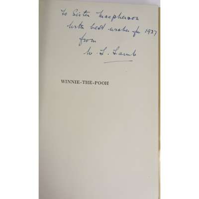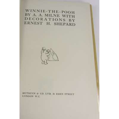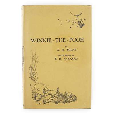 Winnie-the-Pooh. London: Methuen & Co. Ltd., 1926. First edition, 8vo, original cloth gilt, dust-jacket with only very slight bumping to spine ends, a couple of patches of very light soiling and a small red mark to the lower cover, gift inscription to half-title, a little darkening to endpapers