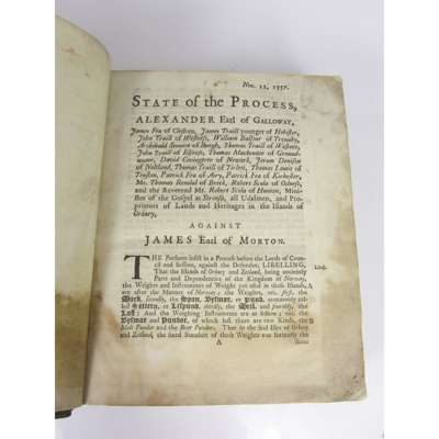 [Drop-head title] State of the Process, Alexander Earl of Galloway, James Fea of Clestren, James Traill younger of Hobister... all Udalmen, and Proprietors of Lands and Heritages in the Islands of Orkney, against James Earl of Morton. [Edinburgh, 1757]. 4to [ESTC T79573]; [bound with] [Drop-head title] Memorial and Abstract of the Proof, for the Earl of Galloway... [Edinburgh, 1758]. 4to, [ESTC T79575]; [bound with] [Drop-head title] Memorial for James Earl of Morton... [Edinburgh, 1758]. 4to, [ESTC T79574]; [bound with] Additional Memorial for James Earl of Morton. [Edinburgh, 1758]. 4to, [ESTC T79572]; [bound with] [Drop-head title] Answers for Alexander, Earl of Galloway... [Edinburgh, 1758]. 4to, [ESTC T79571]; [bound with] [Drop-head title] The Case of Alexander Earl of Galloway... [Edinburgh, 1759] 4to, [ESTC T79562]; [bound with] [Drop-head title] Appendix to the Case of the Earl of Galloway... [Edinburgh, 1759] 4to, [ESTC T79564]; [bound with] [Drop-head title] Memorial for Alexander Earl of Galloway... [Edinburgh, 1759]. 4to, [ESTC T79565]; [bound with] [Drop-head title] Information for James Earl of Morton... [Edinburgh, 1759]. 4to, [ESTC T79566]; [bound with] [Drop-head title] Remarks for Alexander Earl of Galloway... [Edinburgh, 1759] 4to, [ESTC T79567]; [bound with] [Drop-head title] ...The Petition of Alexander Earl of Galloway... [Edinburgh, 1759]. 4to, [T79568]; [bound with] [Drop-head title] Answers for James Earl of Morton... [Edinburgh, 1759]. 4to, [ESTC T79569]; bound in modern half calf gilt, a few manuscript notes, one manuscript leaf bound into rear, bookplate of J. Robertson