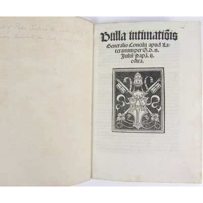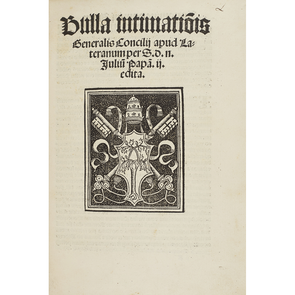 Bulla intimatio[n]is generalis concilii apud Lateranum per S.d.n. Juliu[m] Papa[m] ii. edita. [Rome], 1511. Small 4to (201 x 139mm.), 8ff, Ai-[iv]; Bi-[iv], large woodcut of the Papal coat of arms on title-page, 19th or early 20th century cream parchment, extra blanks at each end