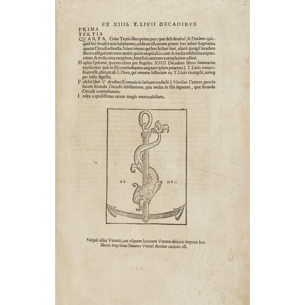 Ex XIIII T. Livii Decadibus Prima, Tertia, Quarta... Duplex Epitome. Venice: in aedibus Aldi, et Andreae Soceri, 1520. First folio Aldine edition, (302 x 204mm.), 4 volumes (of 5) bound in one, 369 Folios numbered: [xiv], 106; [x], 102; [x], 127, large woodcut Aldine device on title and on recto of Index Tertiae Decadis (* of 2nd section), panelled calf gilt by Henderson & Bissett, g.e, lacking volume 5 - the "Polybii Libri VI de rebus Romanis" (Venice, Aldus, 1521) mentioned on the title page, minor worm damage especially to the last few pages, the first repaired, the second professionally repaired but with loss to a couple of letters, the last with damage to a couple of words, occasional waterstains and some early professional repairs, a few small repairs to title-page, extensive early [C16th ?] annotations and marginalia, especially in the first Decade, inscribed in pencil on front endpaper by William Graham (1855-1922), [USTC 838282]
